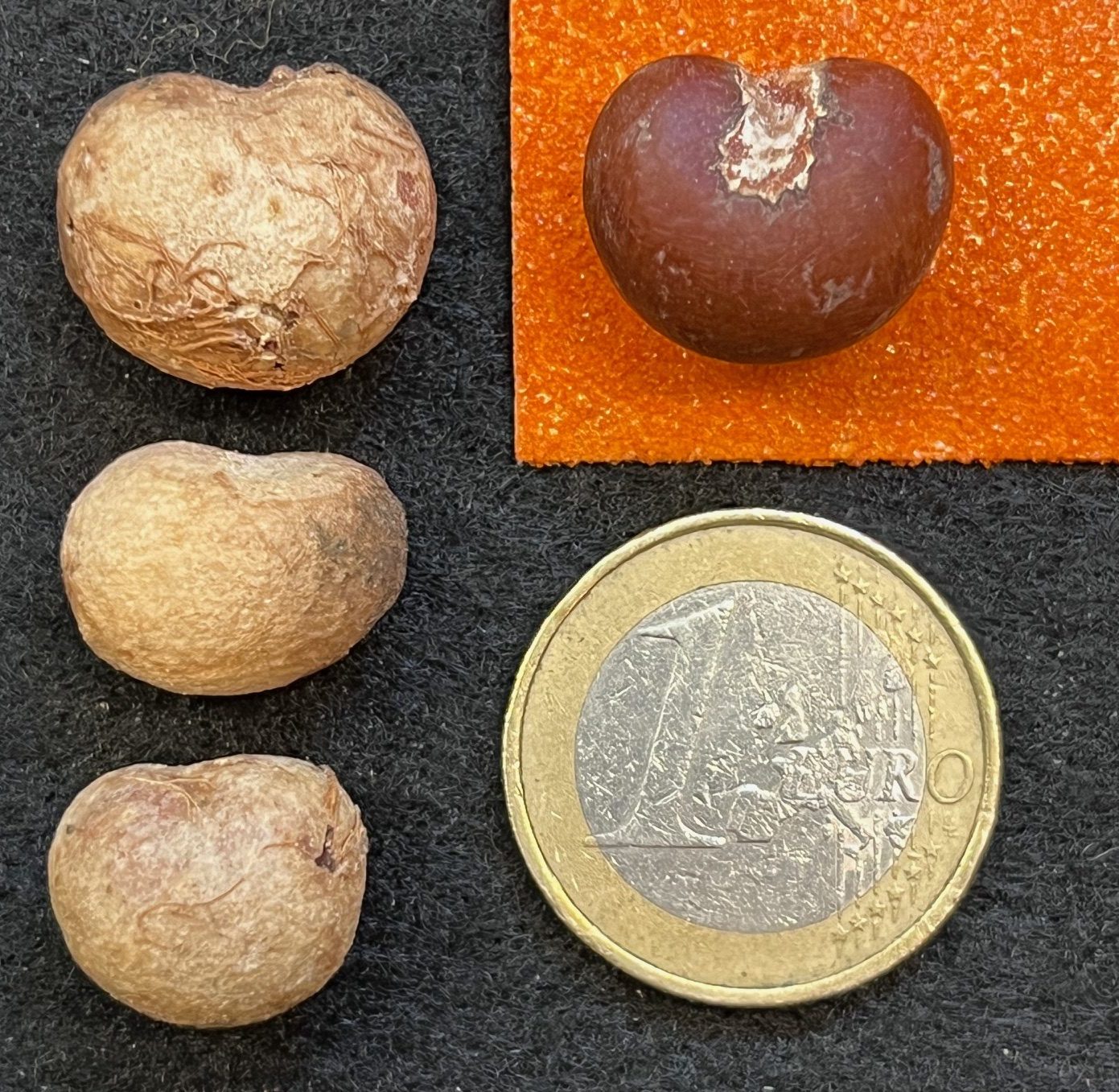 Freshly extracted seeds of Adansonia grandidieri, compared to a sanded seed prepared for germination.